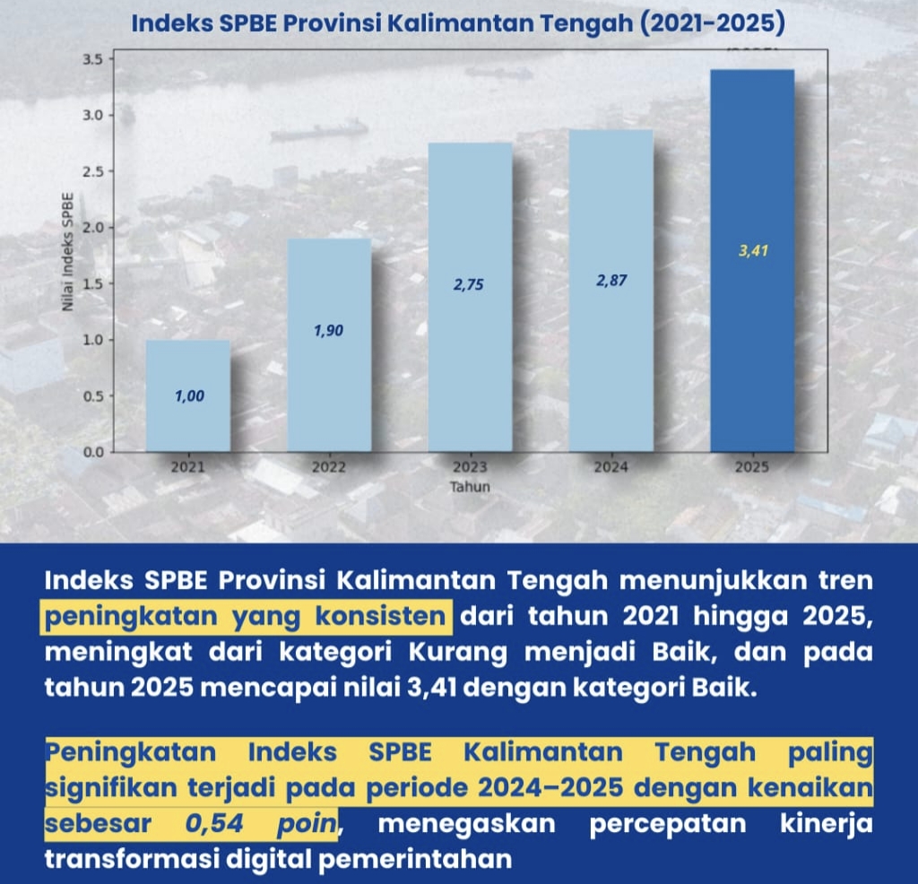 BIMARAYA, PALANGKA RAYA – Pemerintah Provinsi Kalimantan Tengah mencatat Indeks Sistem Pemerintahan Berbasis Elektronik (SPBE) Tahun 2025 sebesar 3,41 dengan kategori Baik, berdasarkan hasil pemantauan Tim Koordinasi SPBE Nasional yang dirilis Rabu, 7 Januari 2026.