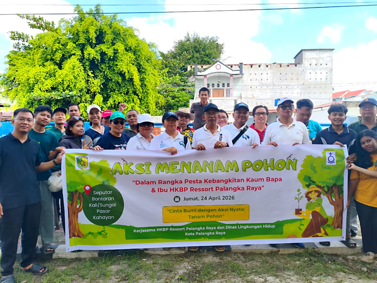 BIMARAYA.COM, PALANGKA RAYA –Menjelang Puncak Pesta Pembangunan Rohani kaum bapak dan ibu, Huria Kristen Batak Protestan (HKBP) Resort Palangka Raya menunjukkan aksi nyata kepedulian terhadap lingkungan. Bertempat di kawasan Pasar Kahayan, Kota Palangka Raya, Jumat (24/4), puluhan jemaat bahu-membahu melaksanakan aksi penanaman pohon sebagai upaya mitigasi perubahan iklim global.